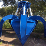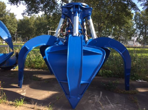 Heavy-duty hydraulic orange peel grab suitable for submerged operations and offshore rock handling.