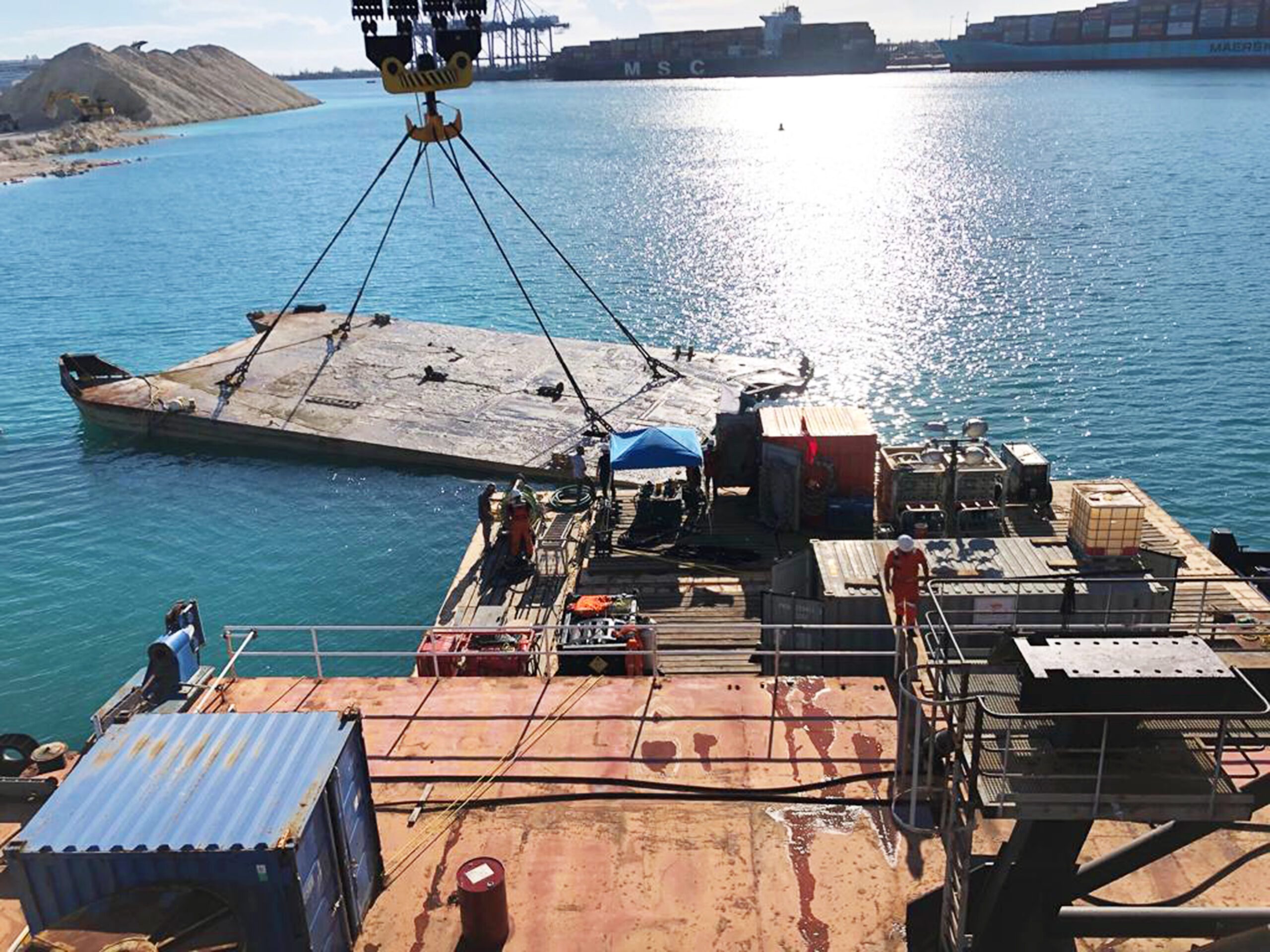 In July 2019, the Conquest MB1 was contracted to refloat a 982 feet (300m) long by 228 feet (70m) wide 25,000t dry dock that had suffered irreversible structural failure and flooding during the docking of a large cruise ship. The engineering team of Resolve Marine formulated a plan to safely refloat the dry dock in two sections. Over the next three months, the drydock was successfully cut into two sections during a guillotine and the Conquest MB1.