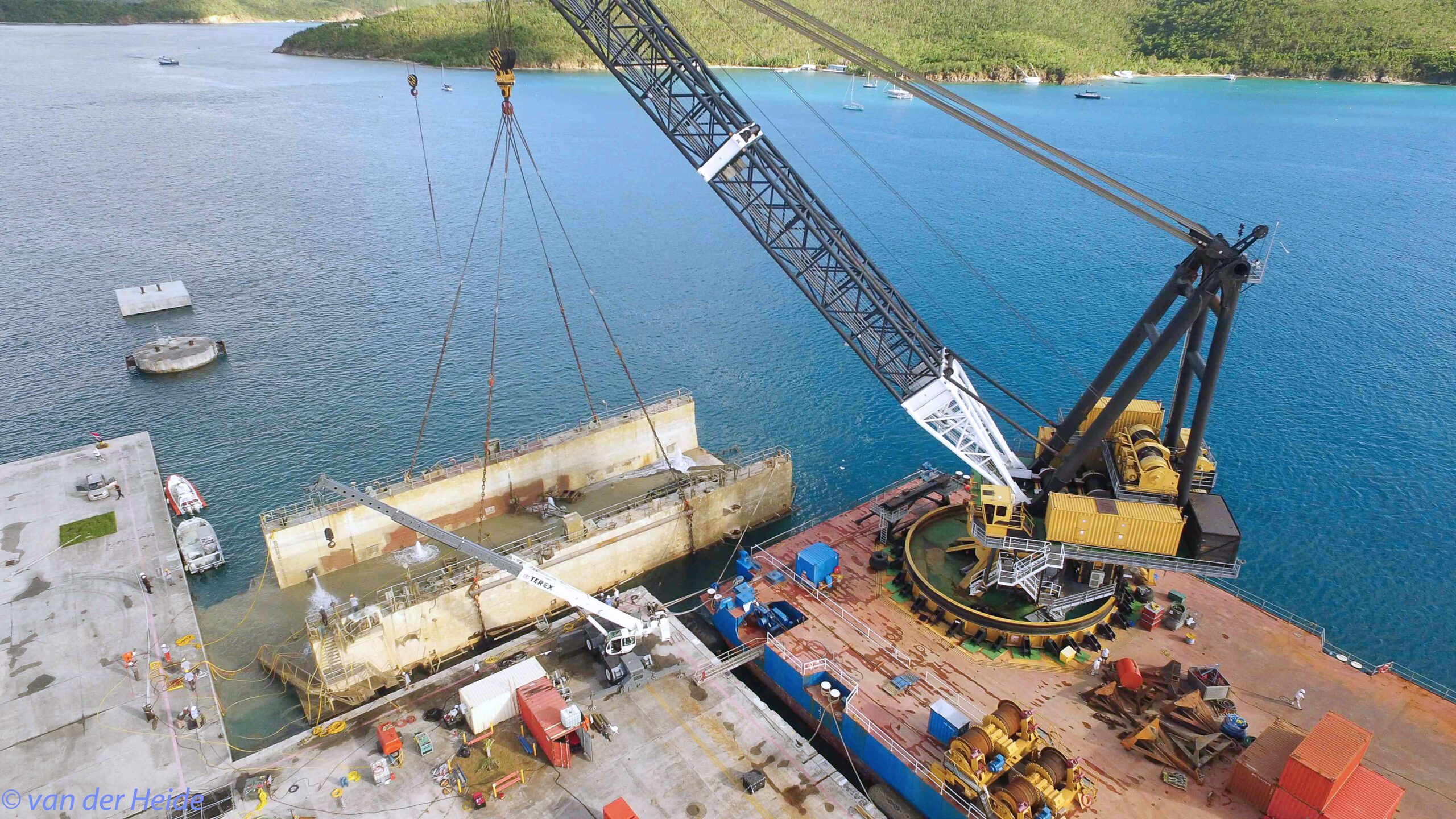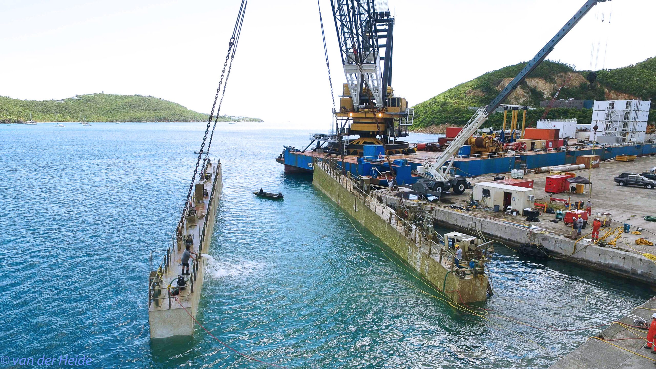 A commercial dry dock dragged its moorings during hurricane Irma and sank alongside the cruise ship pier in St. Thomas, blocking the dock access for cruise ships. Resolve Marine Group mobilized the Conquest MB1, from Louisiana to the site along with a specialized salvage team, heavy rigging and salvage equipment.
