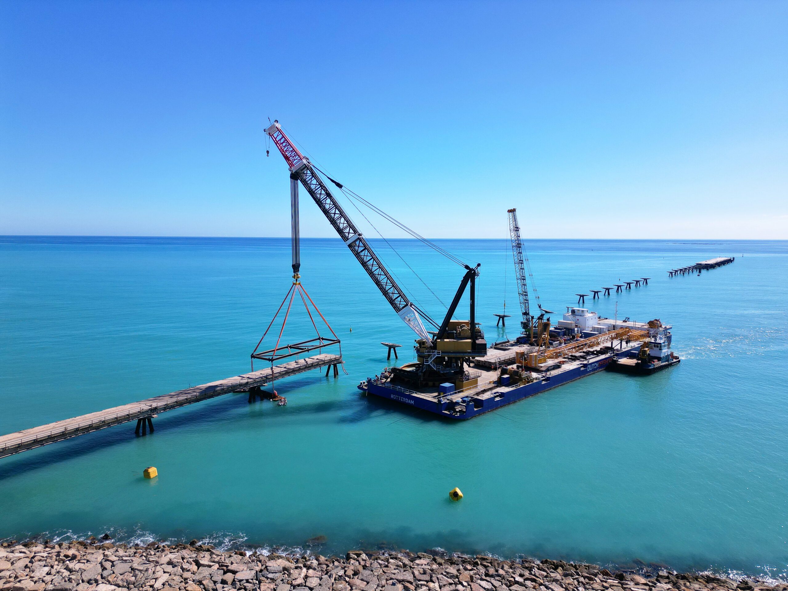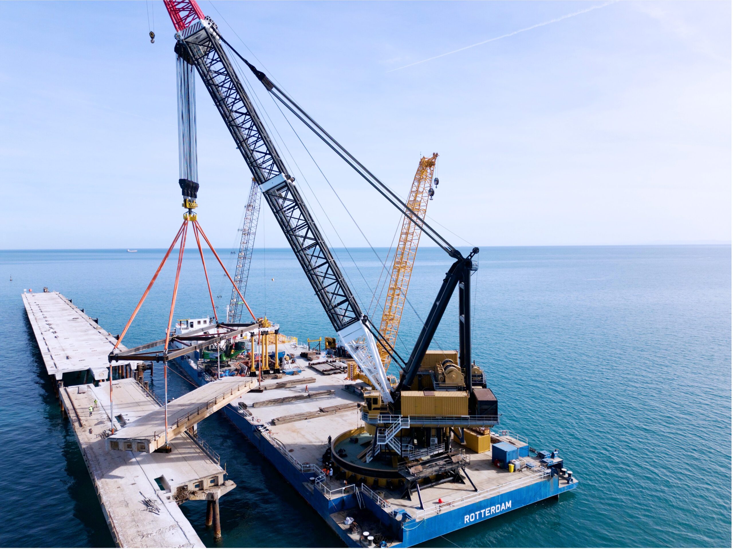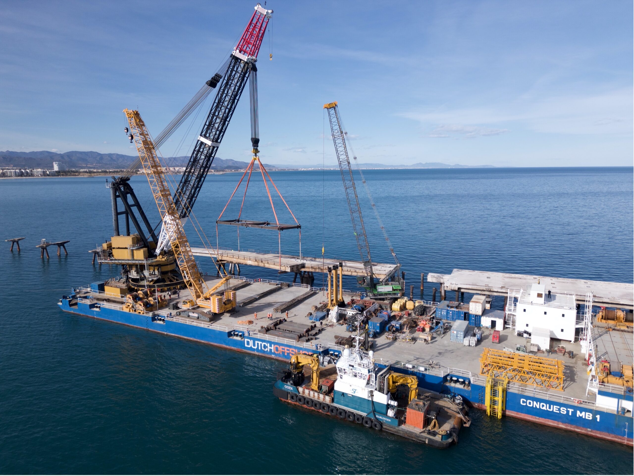 The Sagunto jetty, more than 1100m in length, was built in the mid 70’s by the Mining Company of Sierra Menera and continued to operate as a dock for vessels until 2009. In 2022, after years of deterioration while idle, the Valencia Port Authority deemed it unsafe and put out an emergency bid to have the jetty removed. Sacyr S.A. Construction Company won the bid and called on the Conquest MB1 to team up and tackle the job.